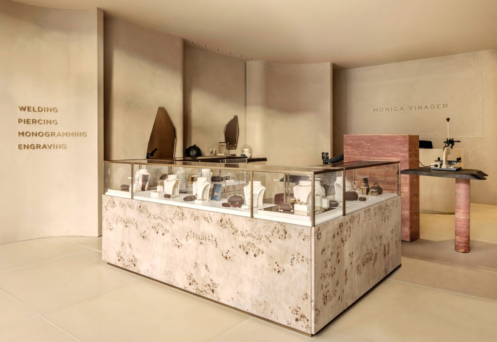 The Monica Vinader flagship store features poplar veneer, red travertine and live edge oak shelving—every design element is aligned with the brand’s reputation for quality, craftsmanship and sustainable practices.